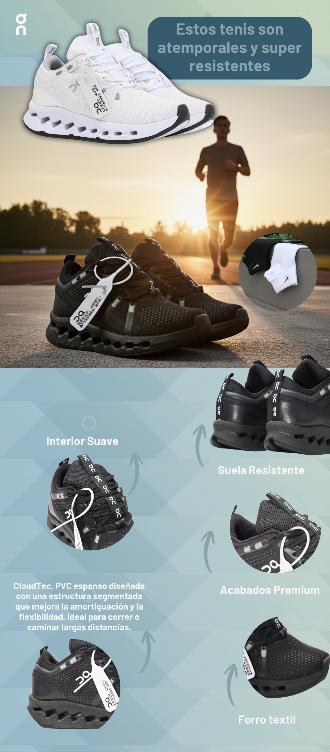 Está diseñado para correr, entrenar o caminar largas distancias. Su tecnología CloudTec® Phase amortigua el impacto y ofrece una pisada más suave y ligera, ideal para uso diario o deportivo.